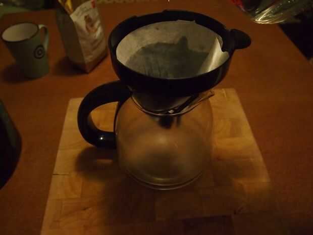De la Hervidora de agua vierta suficiente agua en la cesta completamente mojado el filtro, deje que el agua pase a la olla. Estamos quitando el gusto "de papel" y la calefacción un poco. Café caliente es mejor.