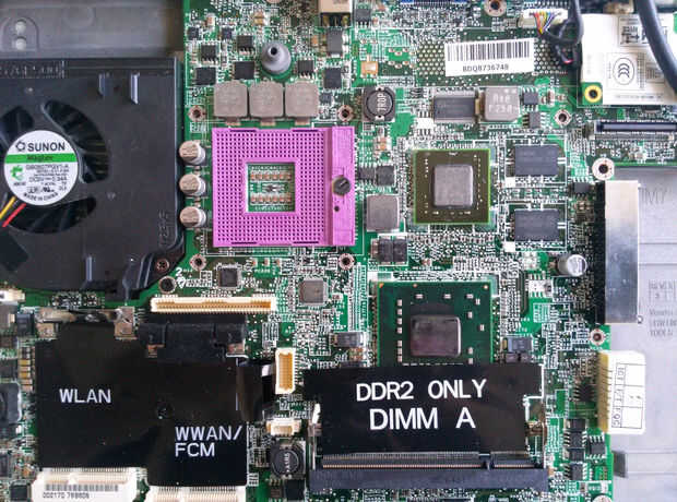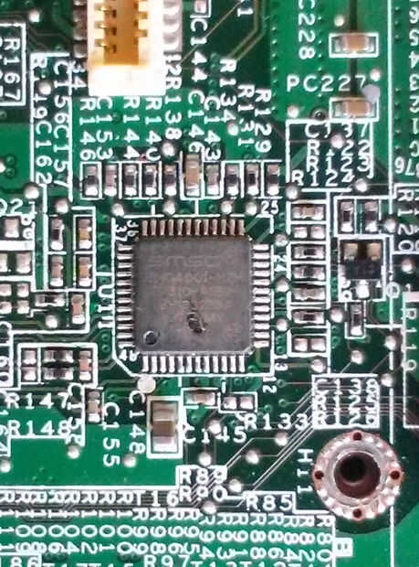 Comencé a buscar en la placa madre por daños físicos. He encontrado en muy poco tiempo la causa del problema. Hay un chip que está cerca del zócalo de CPU que tiene un agujero en la parte superior de la misma. El chip se llama