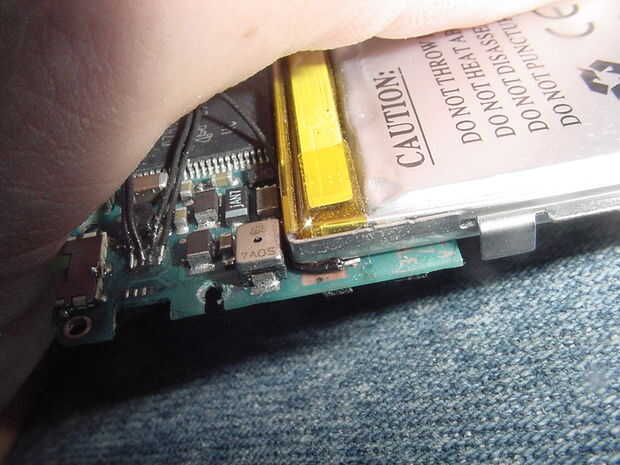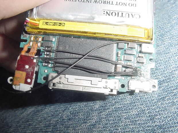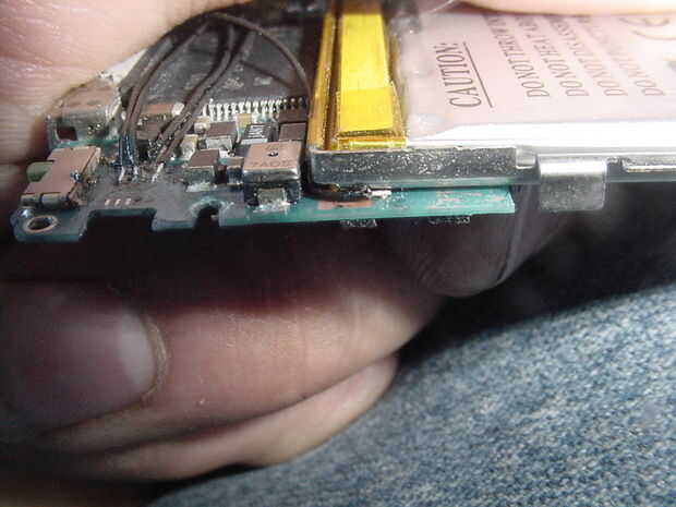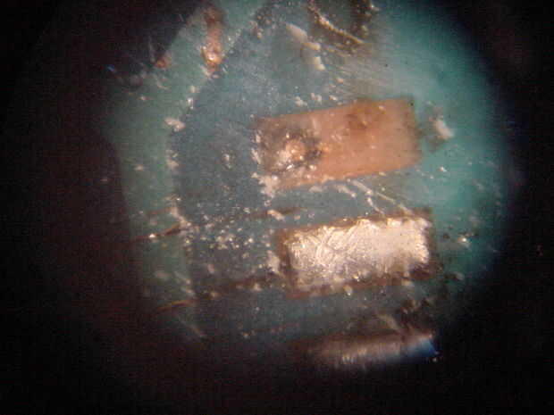 Había empujado una punta de prueba en el contacto (ver imagen de microscopio) y trató de puntos al azar en la placa base para ver si había una conexión soldable. Da vuelta hacia fuera, al otro lado de la placa base, en un pequeño componente (imposible soldar, casi) y también, gracias a Dios, en el mismo lado, al lado de la batería. (Ver imagen)