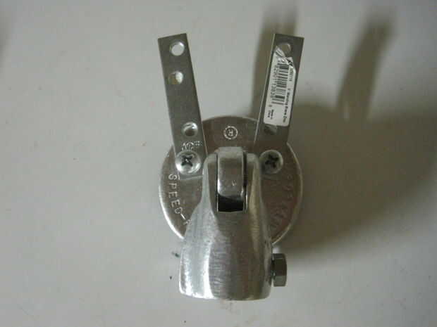 Coloque una abrazadera de reparación frente a cada uno de los agujeros "superiores" con un 1/4"- 20 x 3/4" tornillo y tuerca autoblocante. Orientar los apoyos que señalan hacia arriba, como se muestra. El 1/4"- 20 x 2" tornillo de máquina irá a través del orificio de la "parte inferior" y por el agujero de la horquilla.