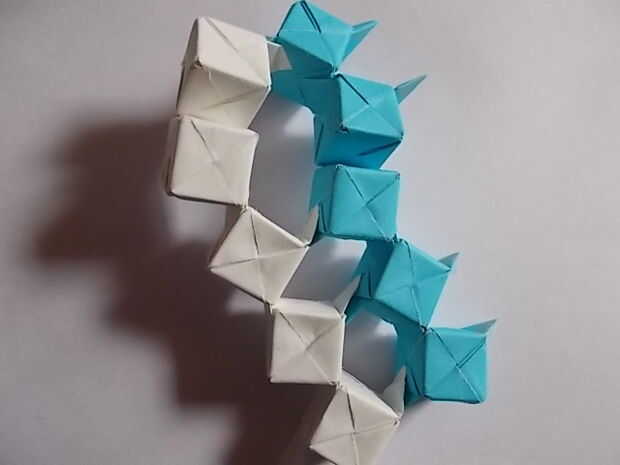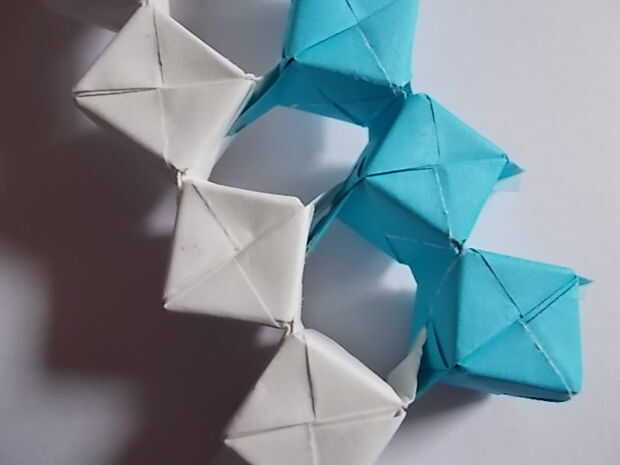 Para conectar las filas, empiece por aplicar pegamento en todas las aletas entre las filas. Luego lentamente Inserte las aletas en los correspondientes bolsillos, recordando que las aletas triangulares poco desde el último paso de fabricación de cada unidad enfrentarán entre sí.
