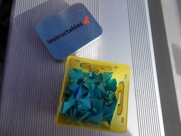 No se desanime por la cantidad de unidades. Es realmente una cantidad relativamente pequeña en comparación con la cantidad requerida para otros proyectos... (buscar "origami modular 3D" para ver lo que me refiero--1080 unidad cisnes y todo eso). Me tomó unas 4 horas porque doblé durante una reunión de pista esperando mis eventos. Usted entra en un ritmo con el tiempo, y me ha sorprendido sobre rapidez tomó respecto a la cantidad de plazas de origami que tenía.