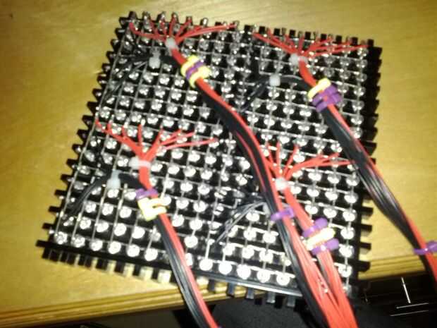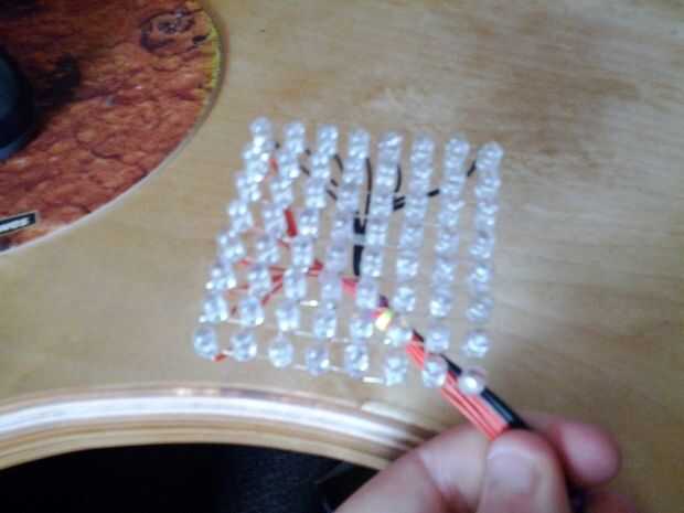 La matriz se mantiene en posición por un acrílico láser cortar Monte, esto también fue utilizada para mantener los LEDs en su lugar mientras estaban siendo soldados, es difícil explicar cómo se construye una matriz de LED a través de sólo texto y no tengo fotos de cuando hacer la matriz, pero hay una explicación bastante buena de cómo construir uno en el Arduino Playground (que es donde I se refiere a cuando el edificio de mina) , básicamente como todos los ánodos están todos en la misma fila y los cátodos están todos en la misma columna y hay no hay cortocircuitos entre ellos no debe tener ningún problema.