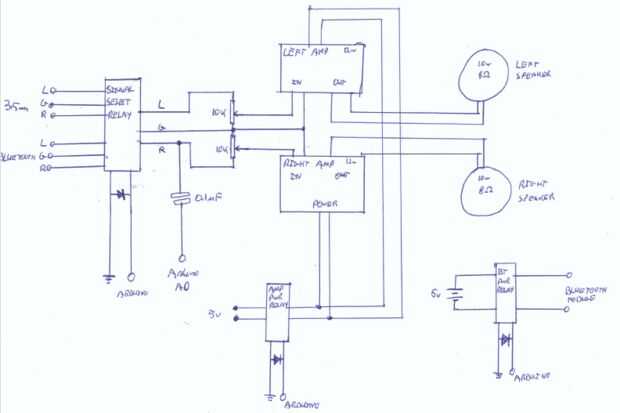 El módulo Bluetooth que utilicé fue un adaptador Belkin de £15 de Amazon, sacó de su caso para hacer más fácil montar dentro de la tabla, debido a problemas de bucle de tierra causando interferencia que tenía que incluir una batería para suministrar alrededor de 6v para el receptor de audio, que me pasé con un relé, el módulo no parece demasiado preocupado acerca de tener un 1v aumento en voltaje de entrada.