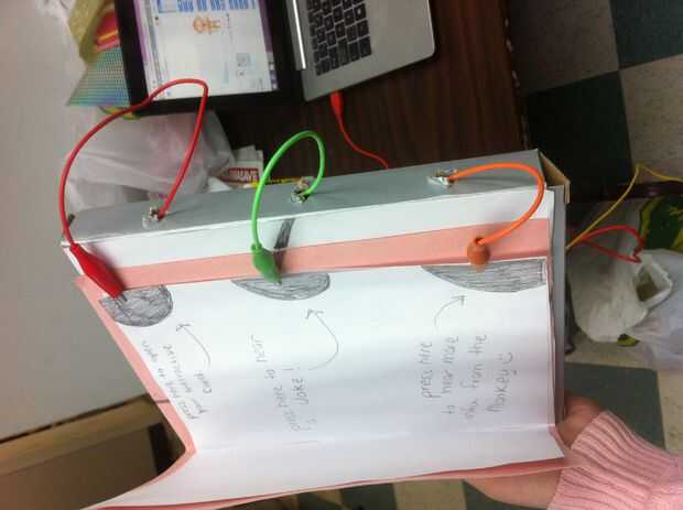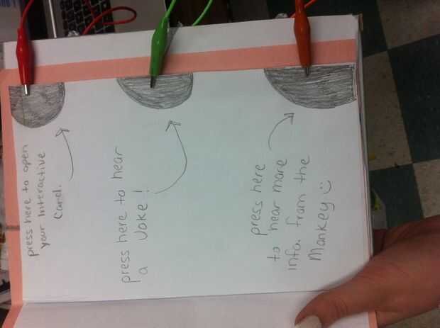 Así, en orden de la tarjeta ser "interactivo", debe conectar la placa de circuito Makey Makey a una computadora, conectar las abrazaderas apropiadas las acciones apropiadas y entonces programar las acciones a la marca (hecha con lápiz), para ello que debe hacer una cuenta de cero al programa de acción que va con que diseño. Por ejemplo, (si conectas una abrazadera para el espacio y a continuación, asigne la tarjeta para decir "Hola" cuando se presiona el espacio, debe conectar esa mordaza a la acción en la que desea, cuando se presiona. Pensar Makey Makey como un controlador en el que puede conectar a cualquier cosa. Aquí hay un enlace en el que puede remix para hacer tu propio que he creado utilizando Scratch! http://Scratch.MIT.edu/projects/46465698/