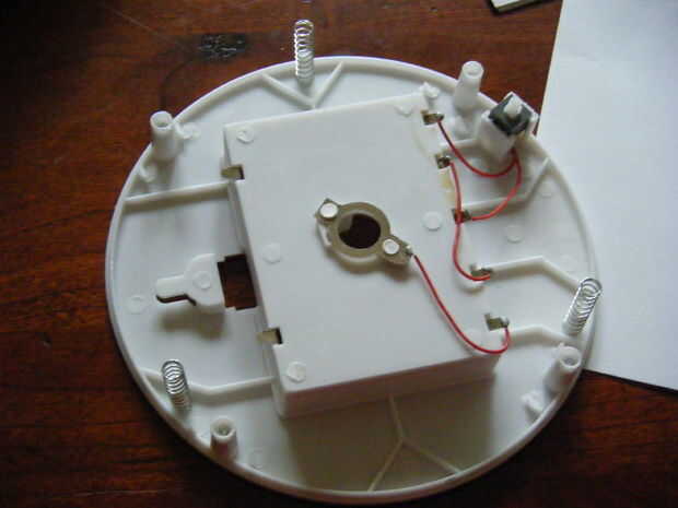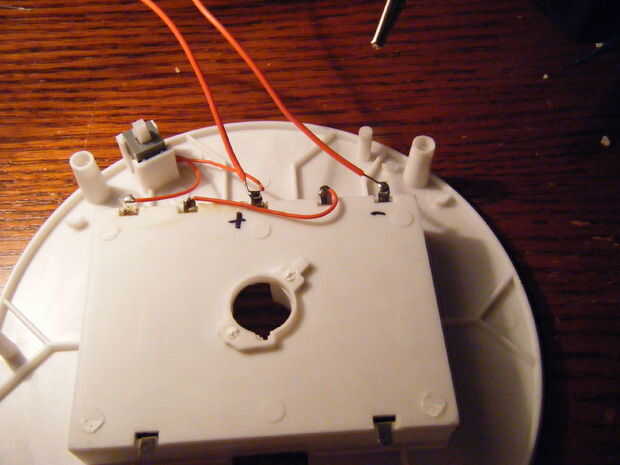 A continuación, abra la carcasa. Ahora tenemos que lidiar con el poder. Retire la pieza de metal en el centro del compartimento de la batería y el cable que conecta a uno de los contactos de la batería. Soldar los cables a los contactos de la batería como se muestra. También puedes etiquetarlas si no tienes cable de diferente color.
