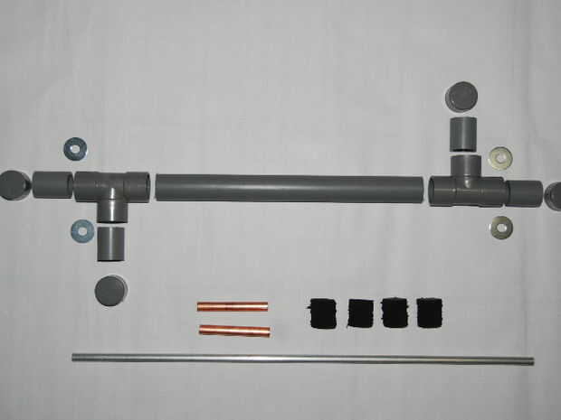 * 4 piezas de tubo de PVC (4 cm de largo). Estos son los conectores entre la pieza en T y las tapas.