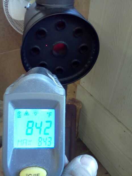 Bueno quisiera decir primero que esta cosa funciona muy bien. Realmente se bombea hacia fuera el calor. Yo solía usar un calentador de queroseno a calor de mi tienda. Con esta unidad ahora uso la estufa de leña para mantener mi tienda parcialmente aislado caliente y tostado. Yo puedo levantar la temperatura de 20 grados Fahrenheit a 70 grados F en aproximadamente 1,5 horas. Anteriormente, con mi estufa solo sin intercambiador, se necesitarían cerca de 3.5 horas para calentar la tienda. Cuando tengo el fuego ruge en la estufa, la temperatura del intercambiador llega a más de 800 grados F. Eso es un montón de calor desperdiciado si no va la chimenea. Con un fuego de tamaño mediano en la estufa, la temperatura central intercambiador permanece alrededor 450 grados F. Me imagino el rendimiento podría mejorarse mediante el uso de tubos de acero más pesados en el núcleo de intercambiador y metal más grueso para la vivienda. Ello permitiría a la unidad retener más calor y redistribuir el calor como el fuego muere abajo, manteniendo la salida de calor más constante. Además, el tubo grande en el centro de la base de cambiador o similar tenemos mucho flujo de aire a través de él. Esto es porque el centro de las aspas del ventilador (hub) no producen mucho flujo de aire. El tubo de centro podría ser omitido, afectando muy poco rendimiento.