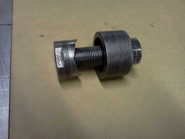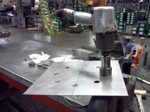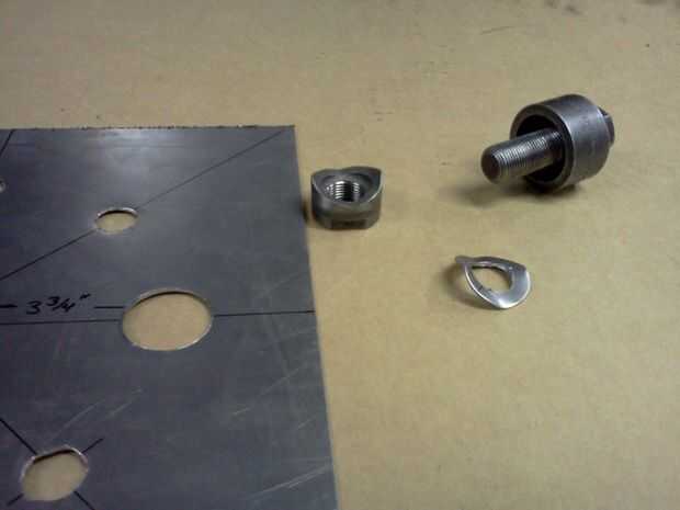 Para usar el sacador K.O., el troquel de corte del círculo es sin roscado en el eje. El eje se inserta a través del orificio de 3/4 previamente perforado en la pieza de trabajo. El perno se aprieta luego, tirando el dado de corte a través del metal de hoja, creando un agujero perfecto. Utilicé una pistola de impacto neumática apriete el K.O punch y acelerar las cosas.
