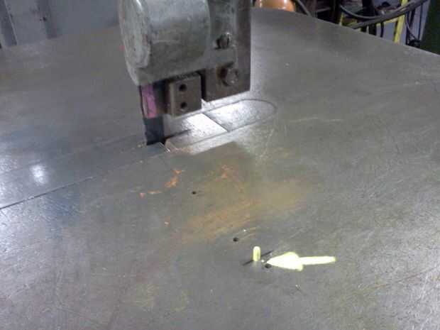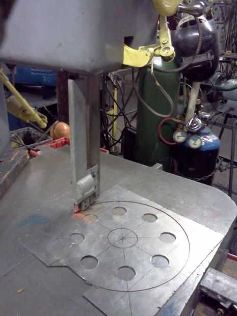A continuación, cortar la forma exterior de las tapas. Para hacer esto, necesitaba determinar el diámetro de la cubeta que estaba usando para la carcasa del intercambiador. Mi cubo fue afilada, así que uno de los extremos de la la unidad tiene un diámetro de 11-1/4" y el otro extremo es 10-1/2" de diámetro. Para cortar la tapa del extremo en un círculo casi perfecto, usé una sierra de banda vertical. Perforé un orificio de diámetro de 1/8" en la mesa de Sierra de cinta la distancia lejos de la lámina igual al radio del círculo deseado. También perforé un orificio de 1/8" en el punto central de las tapas. Inserta un perno de acero de 1/8" a través del orificio en la chapa, en la mesa de la sierra. Antes de empezar cortando el círculo, tuve que recortar la chapa en el mismo lugar para permitir una ubicación para la hoja de Sierra de banda empezar a cortar. Ahora inserte el pasador a través de ambos orificios, encienda la sierra y girar la chapa alrededor del perno de centro para cortar un círculo.