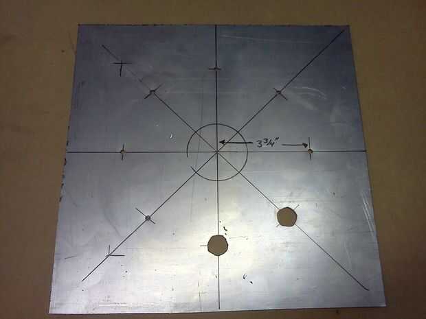 Por último, corté el orificio central de 2-3/8". Para ello, perforé una serie de agujeros de 5/16" de diámetro alrededor de la circunferencia del círculo. Luego utilicé un cortador rotatorio de la herramienta y carburo para conseguir la forma final.