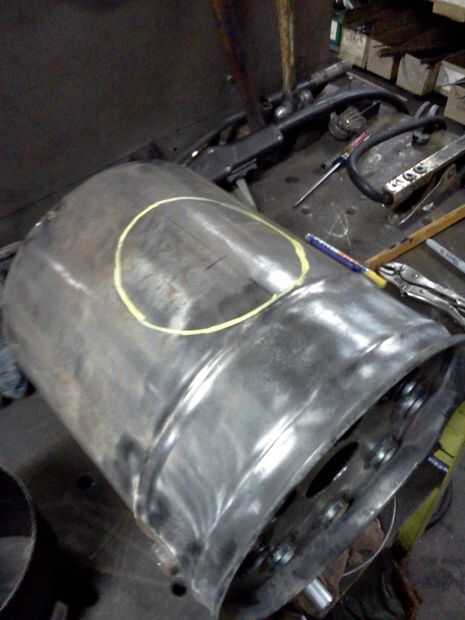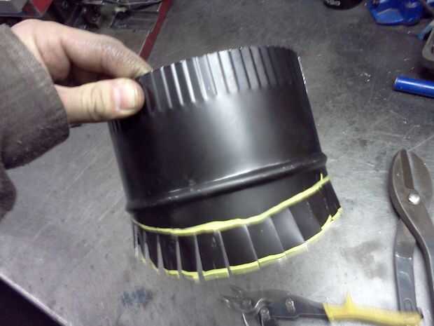 Una vez que el cubo fue configurar todo bien, pude continuar poniendo hacia fuera los agujeros de entrada y salida. Esto era un procedimiento del globo ocular para mí. I establecer la Unión en el cubo y había centrado por el ojo. La Unión y el cubo tienen una costilla grano enrollada a su alrededor para mayor rigidez. Localicé la Unión para que su grano se Contacta con el talón en el cubo. Esta zona es más rígida que el resto de la canastilla de lo que es una buena ubicación para la soldadura. las uniones de tubería de estufa son no exactamente redondas. Tienen un lado plano, donde está la costura. Estaba seguro de mantener la costura en la misma posición mientras el montaje de los sindicatos. Cuando estaba satisfecho con la ubicación de la Unión, usé un marcador sostenido firmemente a la Unión para marcar el lugar. Yo utiliza tijeras para cortar la abertura, ajuste cuidadosamente para tratar de hacer sólo lo suficientemente grande como para permitir que la Unión de ajuste tan apretado como sea posible del agujero. Una vez que conseguí un buen ajuste, se deslizó la Unión en el cubo, luego un mercado de pintura se utiliza para dibujar una línea alrededor del perímetro de la Unión.