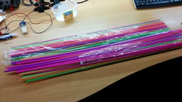 El intercambio se realiza en Pajitas para beber. Paja normal es sólo alrededor de 20cm de largo pero logré encontrar paja 75cm de largo en internet. La paja tiene un espesor de 0,1 mm y 6,5 mm de diámetro. 91 fueron utilizados en el diseño actual. Efectivamente cada paja tiene una superficie de alrededor de 140 cm² (es 150, pero no se utiliza). Con un total de 91 pajas, esto da una superficie total de 12500 cm². Más de un metro cuadrado o 13,5 pies cuadrados.