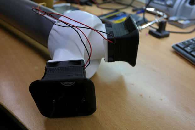 Los fans son fans de 60mm estándar. Los ventiladores se clasifican en 38 m²/h, pero debido a la resistencia del intercambiador, se logra probablemente una fracción de eso. Los ventiladores consumen 1.75W cada. Los ventiladores tienen adaptadores para montar cosas como mangueras de aspiradora. ventiladores de 60mm no son ideales. Son ruidosos y no que eficiente. En el futuro podría reemplazarlas con algo más silencioso y más eficiente como ventiladores de 120mm.