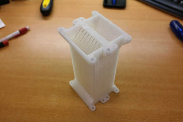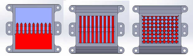 Las paredes del intercambiador son 0,3 mm de espesor. Dimensiones externas del intercambiador son 15x8x7cm pero tiene un área superficial interna de alrededor de 1000 cm² (1/10 de un metro cuadrado o sobre un cuadrado de pie). Se imprime en PLA y toma alrededor de 10 horas para imprimir en 0,16 mm de espesor de capa. Con adaptadores especiales puede caber los ventiladores de 60mm y todos los adaptadores que he diseñado.