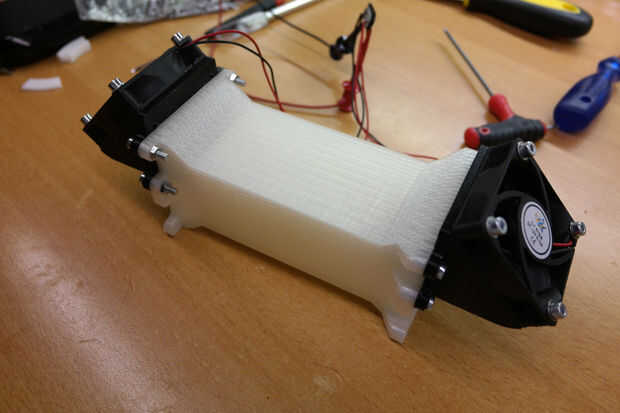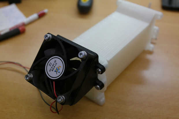 se imprimieron adaptadores especiales para conectar los ventiladores de 60mm para el intercambiador de impresión 3D. Los accesorios utilizados en el intercambiador de calor impreso parcialmente 3D montar también en la versión impresa totalmente 3D.