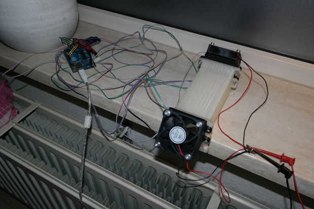 Para medir la eficacia real de las entradas fue suspendido sobre una fuente de calor (es decir. un calentador) y la otra entrada estaba en un lugar más fresco. Ambas configuraciones cuentan con 4 ventiladores, 2 para cada flujo. La fuente de calor es aproximadamente 35° C mientras que el lado más fresco es de alrededor de 19° C.