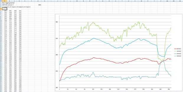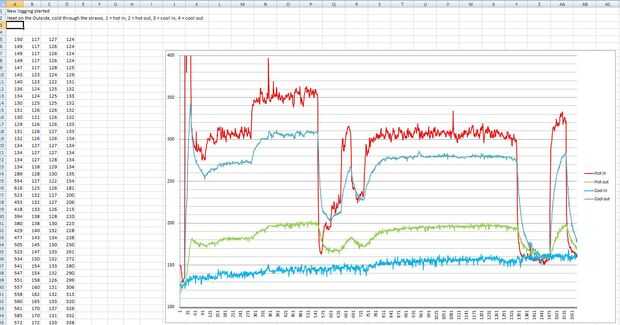 El tercer y último gráfico es el intercambiador de calor impreso totalmente 3D. Los ventiladores fueron funcionados en 10V para reducir el flujo. Cada número inferior es de 6 segundos, el total de la prueba duró poco más de una hora. Otra vez de arriba a abajo, las líneas son: caliente en enfriar hacia fuera, caliente hacia fuera, enfriar. La térmica 'desfase' de este intercambiador es mucho menor. Las 2 veces usadas será el pico a 120 y el valle en 210.