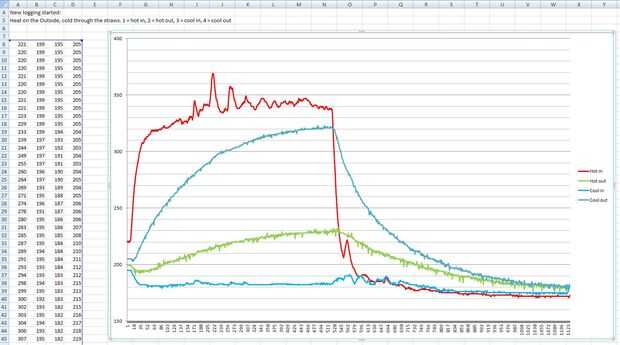 La primera gráfica es una prueba corta del intercambiador parcialmente impresa dentro de mi casa. Cada número inferior es 1 segundo, el total de la prueba fue alrededor de 18 minutos. De arriba a abajo, las líneas son: caliente en enfriar hacia fuera, caliente hacia fuera, enfriar. El aire caliente fue quitado demasiado pronto, la línea no era estable. La situación de establos: HI: 34° C, HO: 23° C, CI: 18° C, CO: 32° C. Poniendo estos valores a través de las fórmulas de eficiencia da 68.75% para el flujo caliente y 87,5% para el flujo frío. Esto promedia 78.125% de eficiencia. La diferencia en rendimientos es debido a los diferentes flujos y errores de medición. Interesante para ver es termal 'lag' del intercambiador. Tarda más de 10 minutos en el intercambiador a una temperatura estable.