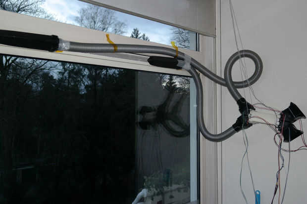 Esta configuración tiene algunos inconvenientes. En primer lugar, los fans son muy ruidosos. Esta no es una configuración que puedo ejecutar mientras estoy en casa. La segunda es que las mangueras fugas de calor. No se aíslan y se precaliente y preenfriar el aire. La prueba se realizó con el aire exterior alrededor de 0° c, sin embargo, el aire entrante ya era 6° C después de sólo 50cm de manguera. La manguera más larga tiene una diferencia de más de 10 ° C. La tercera cosa es que realmente no puedo cerrar mis cortinas con los tubos en el camino. Puedo quitar las mangueras para cerrar mis cortinas mientras yo estoy casa. No se ejecutará cuando sea casa de todos modos.