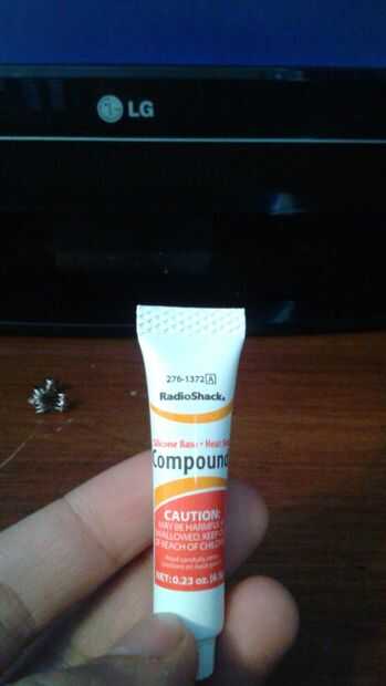 Tomar el compuesto y poner una gota pequeña en el dado. No ponga demasiado. ADVERTENCIA QUE PUEDE ASFIXIAR SU TARJETA. La tapa encima y pones dos tornillos en y ponga cinta sobre él.
