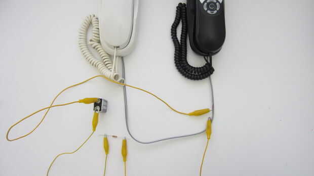 Conecte un terminal de la batería a uno de los cables rojos y conecte la otra terminal de la batería a la resistencia. Luego conecte el extremo libre de la resistencia al otro cable rojo. Enchufe el cable de teléfono en ambos teléfonos y estés listo para probarlo.