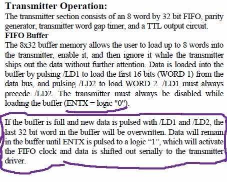 Habilité el modo del loopback por iniciar un reset y secuencia de inicialización descritos anteriormente y esta vez lo que permite el modo del loopback. Luego dentro de un bucle transmite una palabra de prueba y recibí los resultados de ambos receptores. Esto trabajó correctamente sólo la primera vez pero no enviaría varias palabras de la prueba. Así que, ¿qué estaba haciendo mal? Una rápida revisión de la hoja de datos DEI 1016 me mostró lo que se me olvidaba: