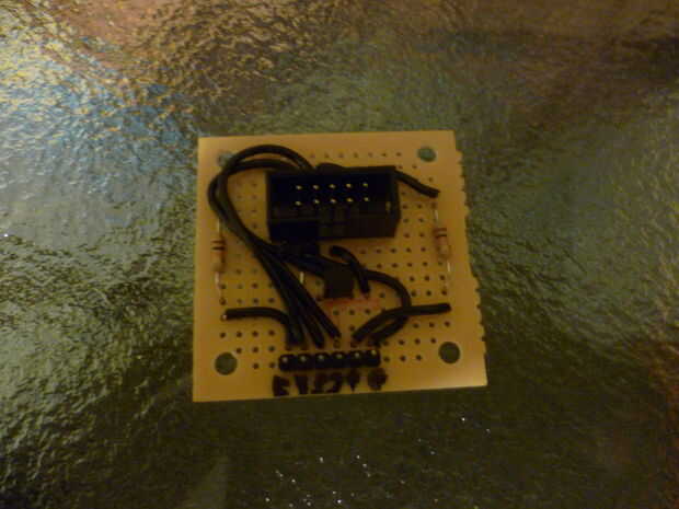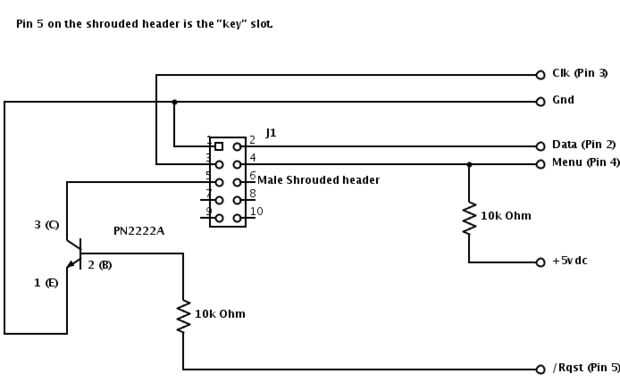 El Arduino se conecta al cable Mitutoyo con unos pocos componentes. 2 x 5 cubierto encabezado que mates al conector hembra en el cable, un transistor PN2222A y dos de 10 k Ohm resistencias. Una resistencia se utiliza con el PN2222A para proteger el micrómetro (o pinza) exceso de tensión, otro para el botón de "menu" a la polarización + 5vdc.