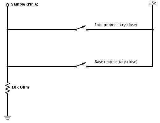 Hay un par más conexiónes que añadimos. En primer lugar, un par de "muestra" botones (pie y dedos) para tomar las mediciones de la muestra 3 puntos de un equipo antes de averageing y usar el promedio final (y rechazar si las muestras están demasiado separadas). Segundo, un circuito reset para el uVGA tarjeta.