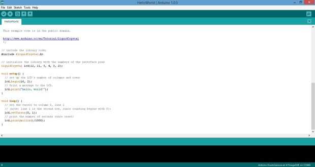 He utilizado el ejemplo HelloWorld de la biblioteca. Usted puede encontrar este ejemplo en el IDE de Arduino siguiendo la ruta: archivo -> ejemplos -> LiquidCrystal -> HelloWorld.