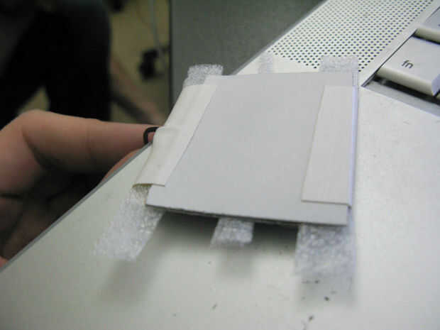 Coloque la espuma entre las almohadillas, doble sobre y cinta el borde abierto opuesto. La construcción debería verse como un sándwich pequeño.