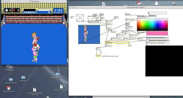 Punch Out utiliza sprites que son siempre del mismo color, pero cuando tu personaje es golpeado durante el juego, su color cambia a un color de rosa funky. Porque la rosa es tan distinta de todos los demás colores, el parche de MAX Lee los píxeles y envía información serial a un arduino.