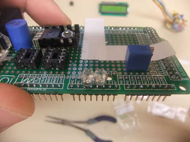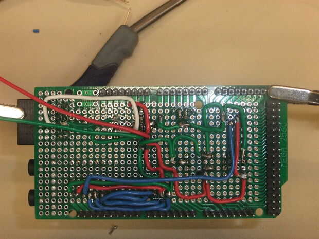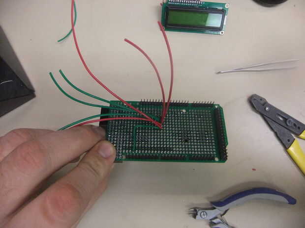 Aquí le damos algunas fotos de mí intentando averiguar donde todo debe ser instalado en el tablero. Además, tengo el tablero montado a mi titular y estoy empezando a soldar las conexiones. Esto va a ser desordenado! Debo añadir aquí que es un escudo que se enchufa directamente en un Arduino Mega 2560.