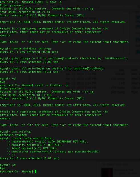 Une es una captura de pantalla de mi configuración de esta base de datos de la línea de comandos de mysql. Aquí es una guía maravillosa para refrescar su memoria en el proceso si necesito ser (sé referencia mensual).