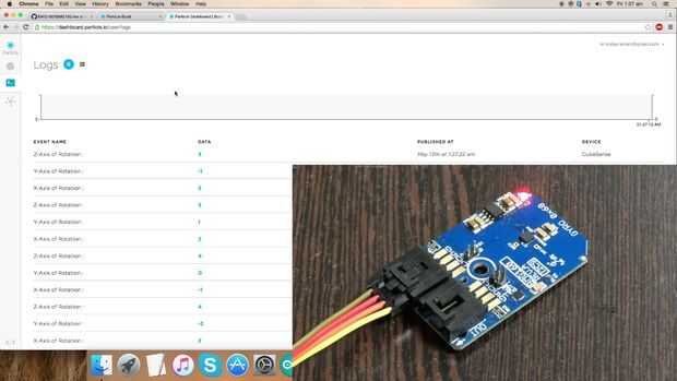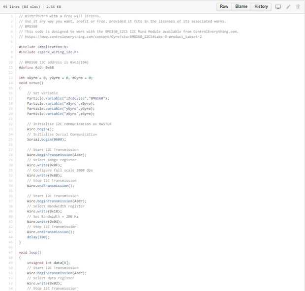 #include<application.h>#include<spark_wiring_i2c.h> // BMG160 I2C address is 0x68(104)#define Addr 0x68 int xGyro = 0, yGyro = 0, zGyro = 0;void setup(){ // Set variable Particle.variable("i2cdevice","BMG160"); Particle.variable("xGyro",xGyro); Particle.variable("yGyro",yGyro); Particle.variable("zGyro",zGyro);// Initialise I2C communication as MASTER Wire.begin(); // Initialise Serial Communication Serial.begin(9600); // Start I2C Transmission Wire.beginTransmission(Addr); // Select Range register Wire.write(0x0F); // Configure full scale 2000 dps Wire.write(0x80); // Stop I2C Transmission Wire.endTransmission(); // Start I2C Transmission Wire.beginTransmission(Addr); // Select Bandwidth register Wire.write(0x10); // Set Bandwidth = 200 Hz Wire.write(0x04); // Stop I2C Transmission Wire.endTransmission(); delay(300);}void loop(){ unsigned int data[6]; // Start I2C Transmission Wire.beginTransmission(Addr); // Select data register Wire.write(0x02); // Stop I2C Transmission Wire.endTransmission(); // Request 6 bytes of data Wire.requestFrom(Addr, 6); // Read 6 bytes of data // xGyro lsb, xGyro msb, yGyro lsb, yGyro msb, zGyro lsb, zGyro msb if(Wire.available() == 6) { data[0] = Wire.read(); data[1] = Wire.read(); data[2] = Wire.read(); data[3] = Wire.read(); data[4] = Wire.read(); data[5] = Wire.read(); } delay(300);// Convert the data xGyro = ((data[1] * 256) + data[0]); if (xGyro > 32767) { xGyro -= 65536; } yGyro = ((data[3] * 256) + data[2]); if (yGyro > 32767) {yGyro -= 65536; } zGyro = ((data[5] * 256) + data[4]); if (zGyro > 32767) {zGyro -= 65536; } // Output data to dashboard Particle.publish("X-Axis of Rotation :", String(xGyro)); Particle.publish("Y-Axis of Rotation :", String(yGyro)); Particle.publish("Z-Axis of Rotation :", String(zGyro)); delay(1000);}