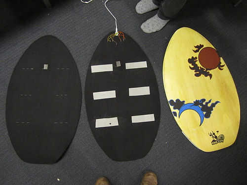Transferir el diseño del sensor de la ilustración a las capas de fieltro, que principalmente desea prestar atención que el sensor delantero derecho se encuentra debajo de la gráfica de sol redondo en el diseño de griptape y que el sensor izquierdo posterior se encuentra debajo de la gráfica en forma de luna.