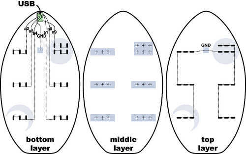 La capa superior es similar a la capa inferior, excepto que aquí todos los hilos conductores individuales están conectados en el punto de tierra común (GND). Este punto es un pedazo de Velcro conductor, permitiendo que una masa común para "saltar" a la capa inferior que se conecta a la placa Teensy.