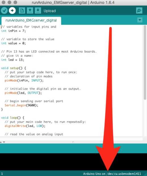 4. abrir el archivo de Arduino que se llama "runArduino_EMGserver_digital.ino" y subirlo a la placa Arduino. Tome nota del puerto de comunicaciones en la esquina inferior derecha de la ventana de Arduino. Debería decir "Arduino Uno en blahblahblah". Que parte de blahblahblah es el puerto Arduino está conectado a. Se edita el código de python incluido para que sepa qué puerto para encontrar el Arduino.