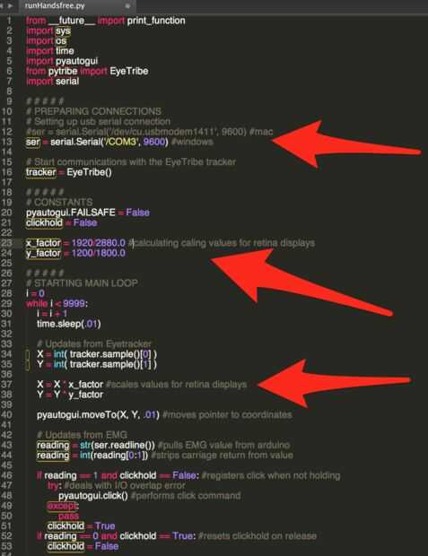 5. en la carpeta 'PyTribe-master' en el archivo runHandsfree.py en la línea 13, esto es donde editas el puerto. Actualmente tiene ' / COM3', pero hay que cambiar a todo lo que usted está usando basado en lo que fue en la esquina de la ventana de Arduino como se indica en el paso 4 en esta página. La línea 12 es un ejemplo de lo que se vería como si se tratara de un Mac.