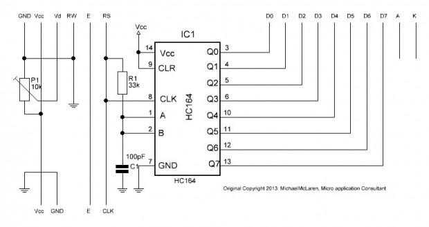 Los circuitos anteriores están todos para el LCD en modo de 4 bits ya que es el más de uso frecuente modo. Sin embargo, Mike MacLaren me señaló a un circuito que utiliza un shiftregister (un 164 o un 595) que utiliza dos cables y completo direccionamiento de 8 bits de la pantalla LCD