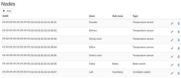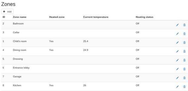 Aquí se pueden crear todas las zonas de la casa. Se puede definir el nombre de la zona y si se calienta (usado más adelante en la página de calefacción). Cada zona tiene un ID único que se utiliza para comunicarse con los nodos a través de VSCP.