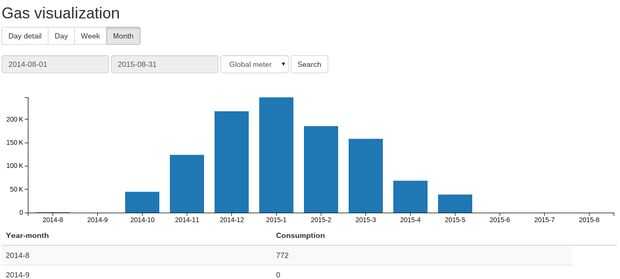 Los nodos pueden conectarse a metros y cuentan consumo (Watts y litros) y envían el resultado cada 15 minutos. La información se puede ver por mes, semana o día para tener una idea detallada de cuánto se consume, Cuándo y por qué aparato.
