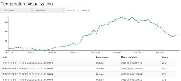 Esta página muestra un gráfico de la temperatura para el intervalo de fechas seleccionado. Una tabla contiene los detalles. Nodos de temperatura envían los datos cada 15 minutos.