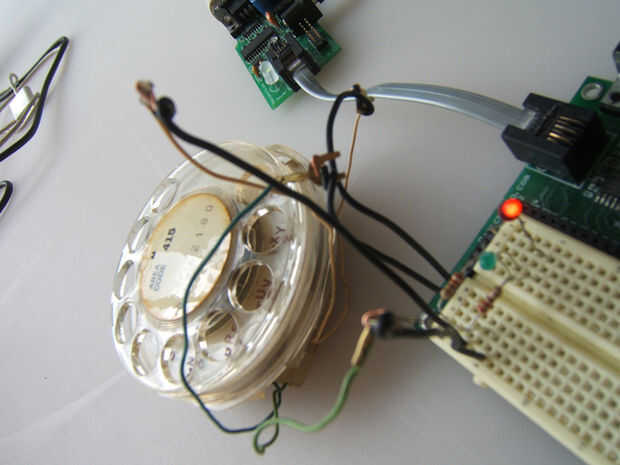Por ejemplo, si usted marca 8, el LED conectado al cable verde y azul se encenderá y 8 veces. Esto sucede porque es una forma de marcar un número de teléfono romper rápidamente la conexión el número de veces para el dígito que está intentando marcar. Así que, otra vez, para marcar un 8 tendrías que romper rápidamente la conexión 8 veces.