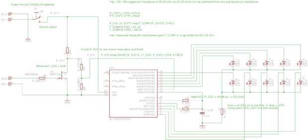 El circuito consta de tres partes; (1) el JFET y carga (2) los LED y resistencia limitadora de corriente y (3) el circuito RC utiliza jury-rig un ADC aproximadamente. En el debate subsiguiente, puede ayudar a ver el circuito esquemático.