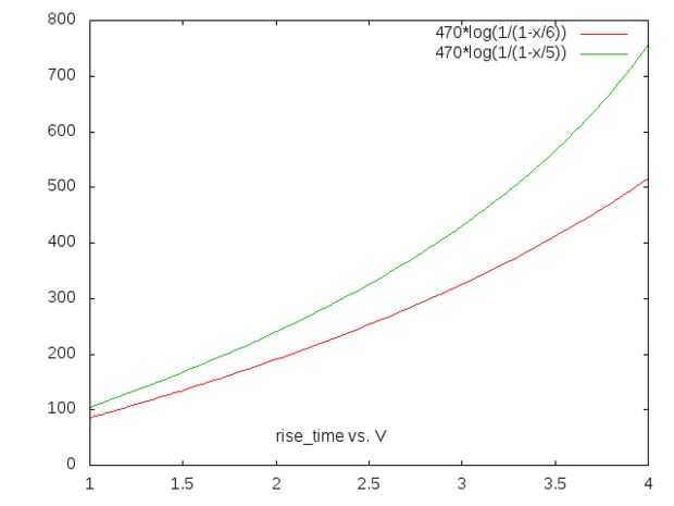 Cuando el JFET está apagado, el voltaje del resistor de carga estará en V_CC. Puesto que la 'rampa' es realmente un exponencial, él no puede nunca acabar conversión en este caso! Para evitar este problema, el voltaje de la resistencia de carga se introduce en un divisor de tensión (22K / 32K) de convenientemente alta impedancia (32KΩ) por lo que no interfiere sensiblemente con la tensión de la resistencia de carga. Con una fuente de 6V el voltaje del resistor de carga dividida oscila entre acerca de 2V a 4.2V, así que la conversión se terminará en menos de 550μS. Uno de los gráficos adjuntos a continuación muestra el tiempo de conversión frente a la tensión medida por una fuente de 5V y 6V. Un pequeño cálculo demuestra que para la fuente de 5V, el tiempo máximo será menor que 600μS. Así el tiempo de conversión total es menos de 1mS.