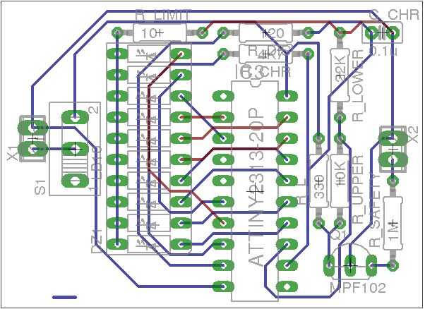 Para medir el voltaje del resistor de carga, necesitaba alguna forma de ADC. El ATtiny2313 no ADC, pero tiene un comparador analógico que puede utilizarse para implementar una rampa ADC. Una entrada para el comparador es la señal que se mide, la otra entrada es una rampa de pendiente conocida a partir de 0V. Midiendo el tiempo para la salida del comparador a voltear, la tensión de entrada puede ser averiguada. (De hecho, realmente no necesita ser una rampa, hará una señal cada vez más conocida, una rampa es generalmente preferida ya que ofrece sensibilidad igual a toda la gama de entrada. En nuestro caso, esto no importa). Para este diseño, se utiliza un circuito RC simple para crear una señal de creciente. ADC de rampa tiene algunas desventajas; (1) el tiempo de conversión varía con la tensión medida, y (2) la medición es afectada por cambios en la V_OH (que depende de V_CC). En este diseño, el primero no es un problema que a lo largo como no interferir con el efecto estroboscópico (que podría cambiar la clavija de corriente continua) y el segundo no es demasiado de un problema (aunque mostrando esto implica cálculo un poco más), principalmente porque la aplicación de ADC de rampa termina (indirectamente) medir el voltaje del resistor de carga dividida por la tensión de alimentación (o más bien V_OH).