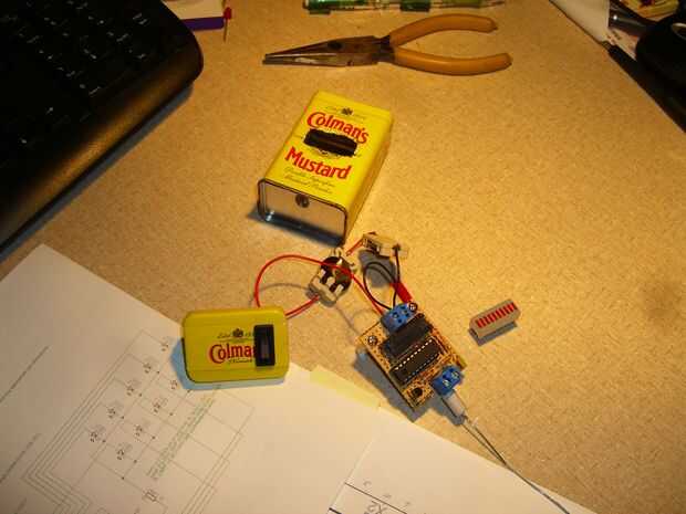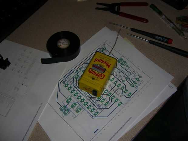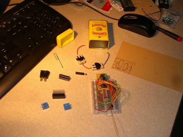 Había soldado el portapilas y el interruptor a y me une a los bloques de terminales. También usé una anilla para sujetar la lata a la tierra del circuito. Me reveló un clip utilizado como la sonda y esto había unido al bloque de terminales adecuado. Pasa el clip de papel enderezado por un borrador que serviría como un aislante y un soporte. Con el zócalo wirewrap, la pantalla LED asomaba a través de la lata, para que esto tuvo que ser insertada después de instala el perfboard. El perfboard era un ajuste mucho más de lo previsto (ya que los bloques de terminales eran más altos de lo esperado), pero un poco de exprimir y maniobras hizo el truco.