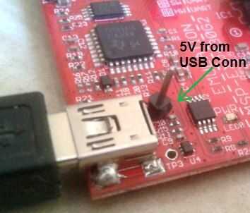 La sección USB en la parte superior del tablero funciona a 5V. Fácilmente puede soldar un pin cerca de la clavija USB y tomar 5V desde allí. Utilice un multímetro para verificar el pin correcto, uno de los pines 5V mientras que el otro es en la tierra.