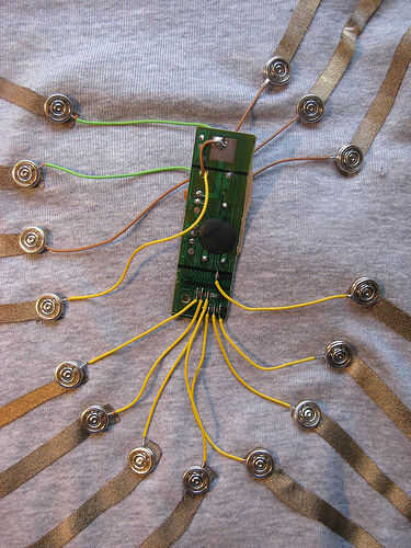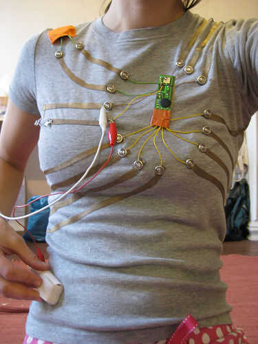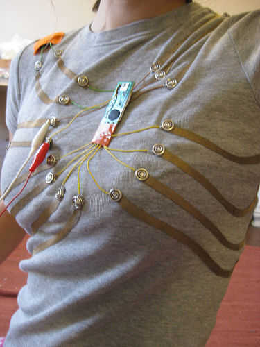 un Piano de juguete incrustado en una camiseta. Tiene 8 teclas de Do a (1 octava). Puede reproducir música simple por llevar la camiseta y pulsar el botón de tela de la camisa. Todos los componentes desde el piano de juguete (baterías, altavoz, placa